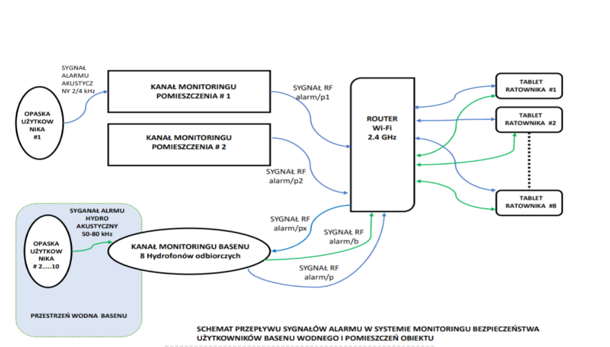 -ma ona zapisane algorytmy topienia, jeżeli użytkownik jest za długo na określonej głębokości albo wykonuje ruchy zidentyfikowane jako nietypowe (niebezpieczne), wówczas wysyłany jest z opaski sygnał ultradźwiękowy, który odbierają znajdujące się w niecce basenowej hydrofony i uruchamiany jest alarm